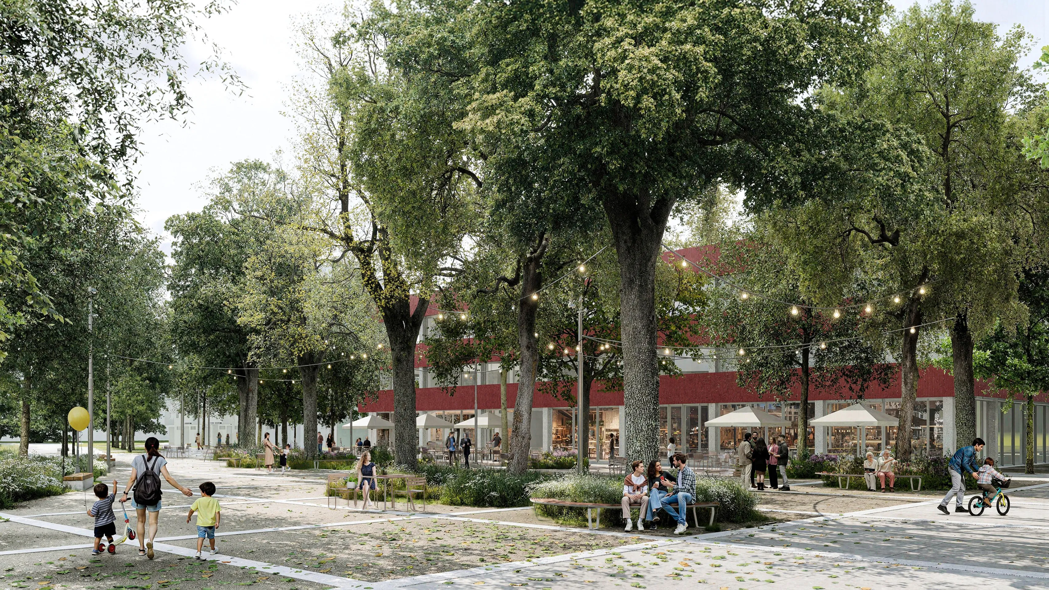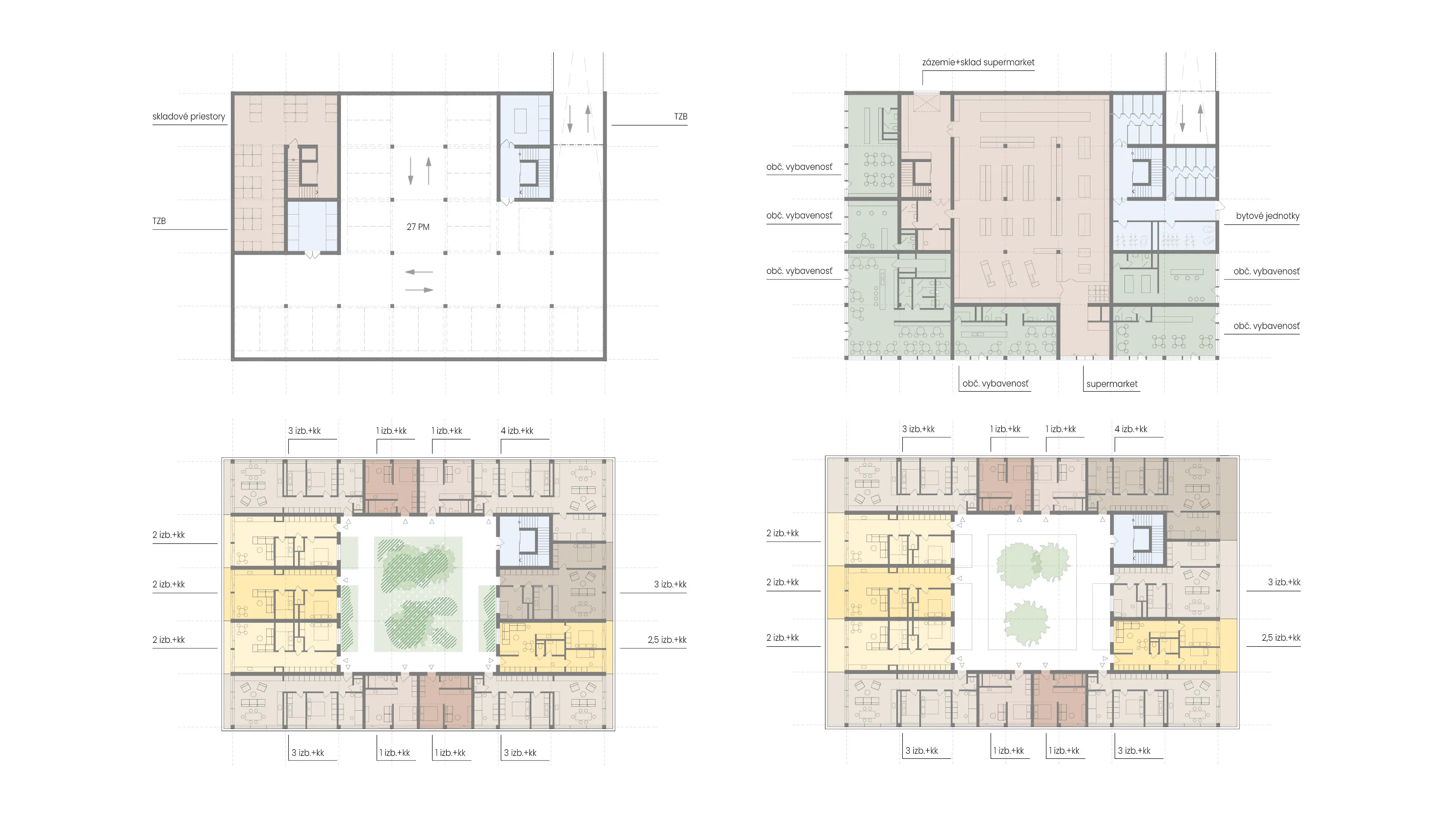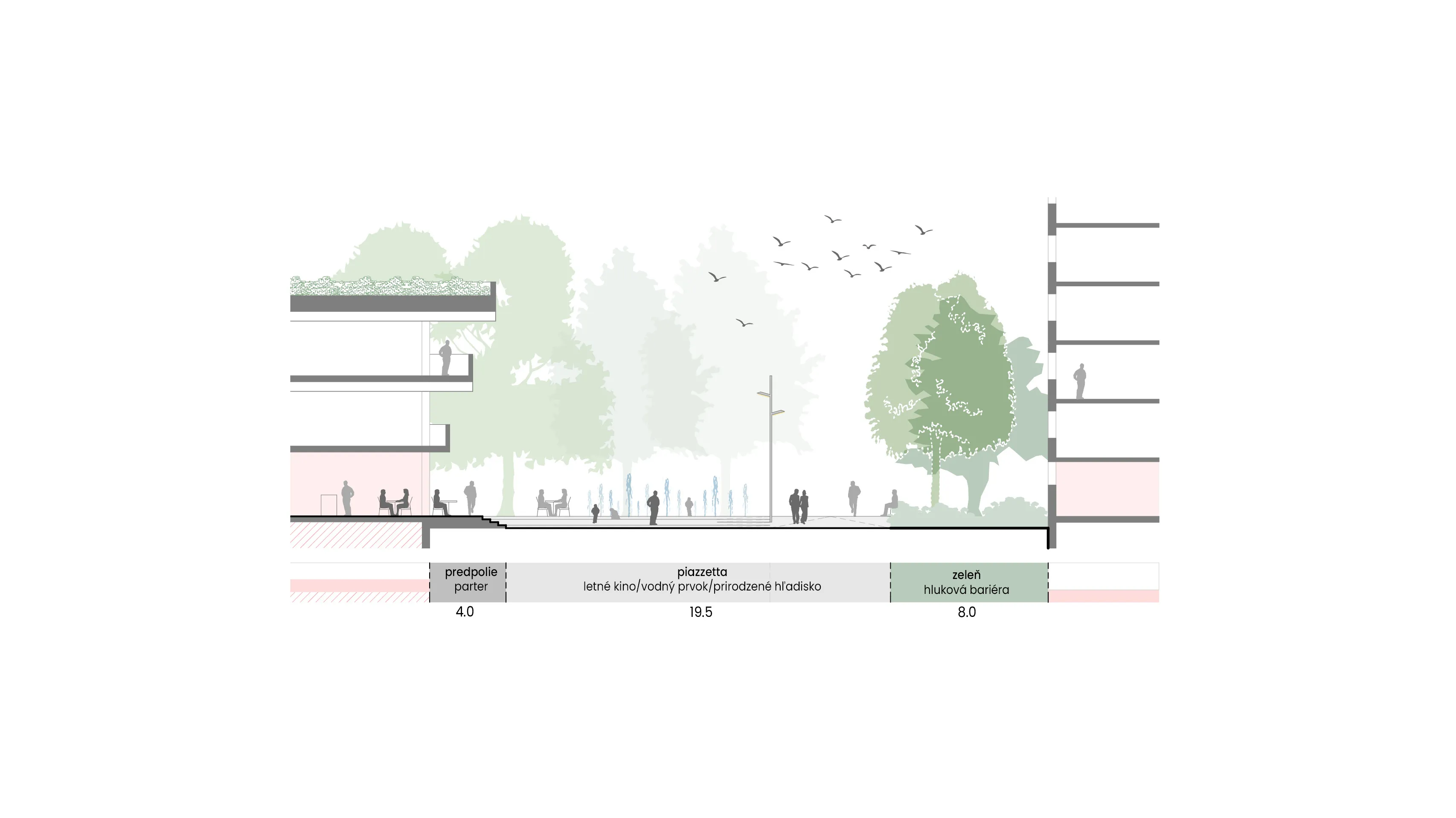 Existujúce stromoradie je doplnené o novú výsadbu, vodopriepustné mlatové plochy a kvetinové záhony. Vzniká tak pobytovo-rekreačný mestský parčík – „pľúca“ územia, oddelený od rušnej komunikácie terénnym valom a zeleňou. Navrhujeme ho ako neformálny, multifunkčný priestor s posedením a s možnosťou vylievania aktivít parteru smerom do parčíku.