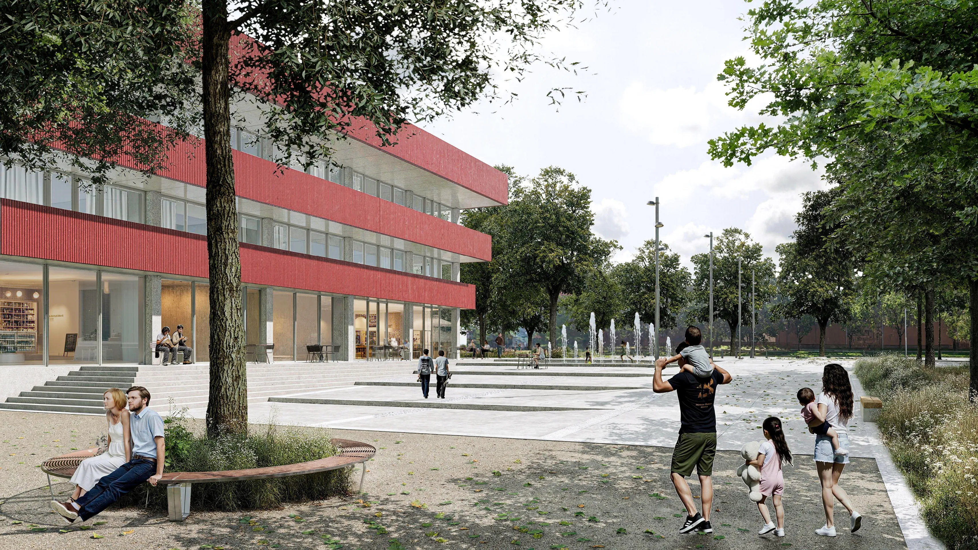 Otvorená plocha je mierne vyspádovaná a puskakovaná do mestskej záhradky s hernými prvkami ,doplnená o pobytové schodisko primknuté k objektu. Poskytuje priestor pre menšie kultúrne akcie, trhy a zhromaždenia. Mobilné pódium a vodný prvok s tryskami umožňujú meniť atmosféru priestoru od každodenného pobytu po príležitostné spoločenské udalosti.
