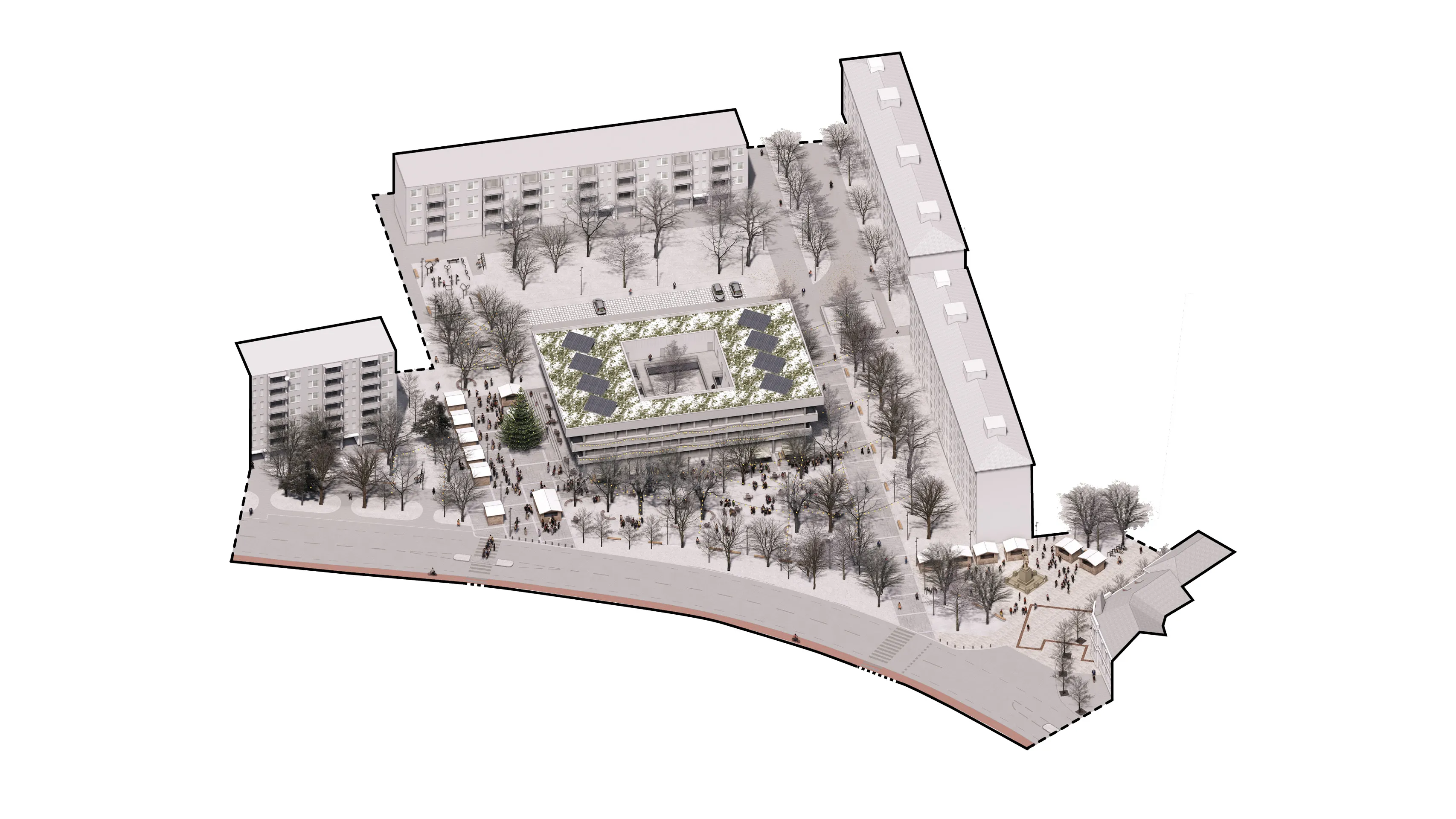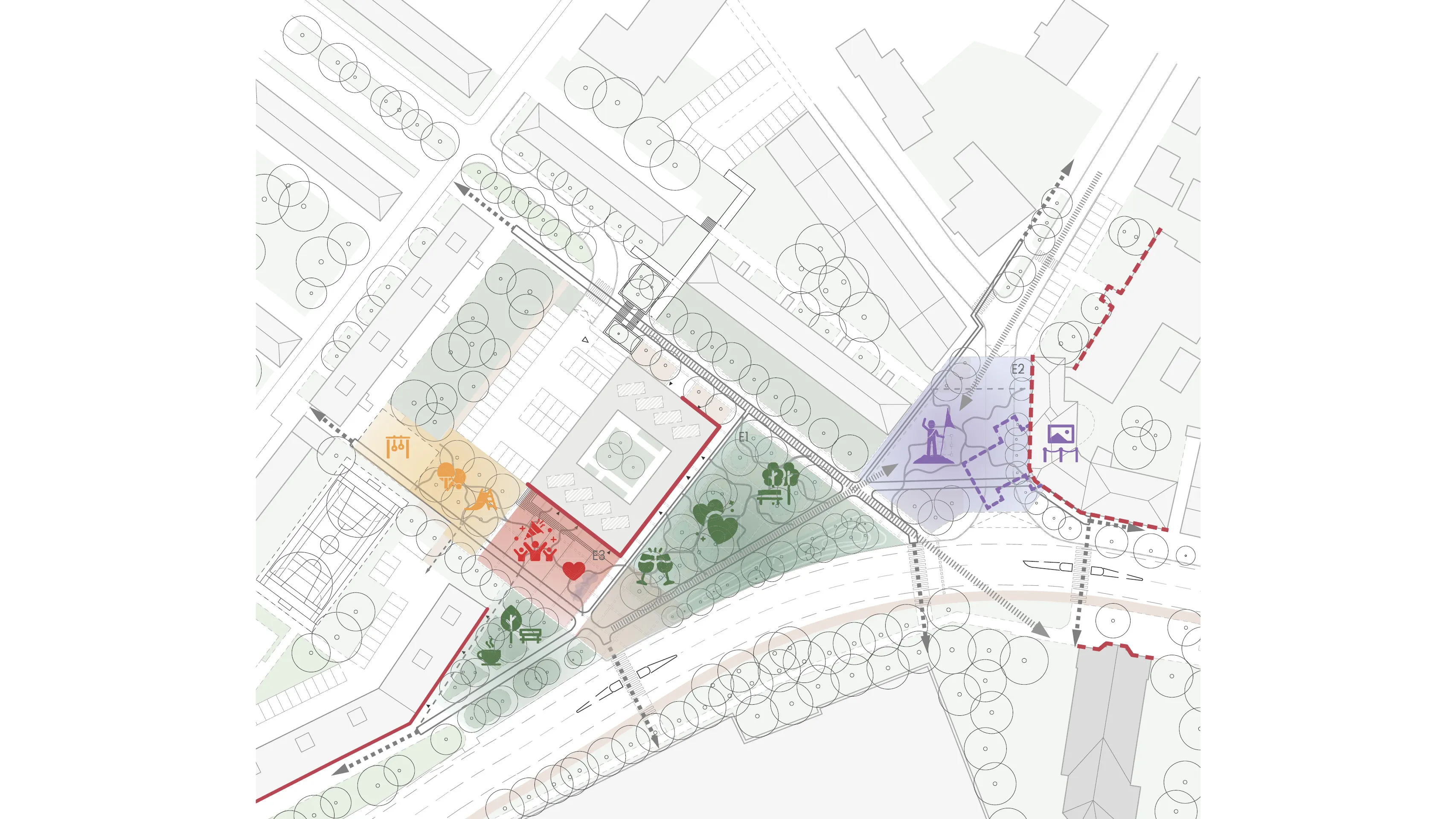 Hlavným determinantom územia je objekt COOP, ktorého nosný systém sa premieta do okolia a stáva sa základom novej urbanistickej štruktúry – „koberca aktivít“, prepojeného sieťou peších a cyklistických trás.