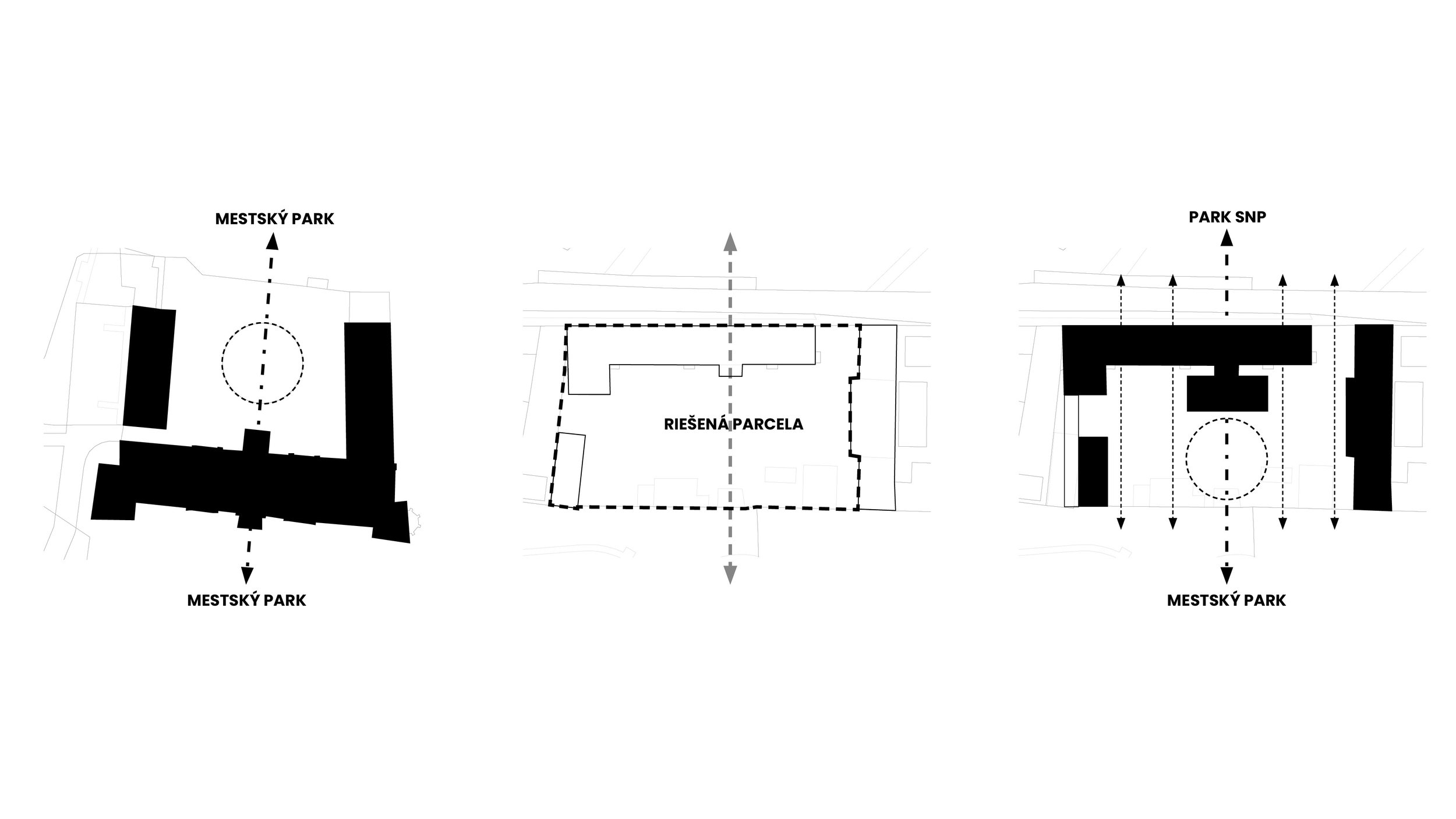 Prepojenie dvoch parkov, formálneho mestského a menej formálneho parku SNP sme v našom návrhu od počiatku považovali za prioritu. Na Školskej ulici regulujeme dopravu a vytvárame nový verejný predpriestor knižnice - malú piazettu, ktorá spája hlavný vstup a park SNP. V rámci lokálneho mikrourbanizmu považujeme za hlavnú ideu pôdorysnú a hmotovú analógiu budovy knižnice, a priľahlých stavieb na parcele s Esterházyho kaštieľom.