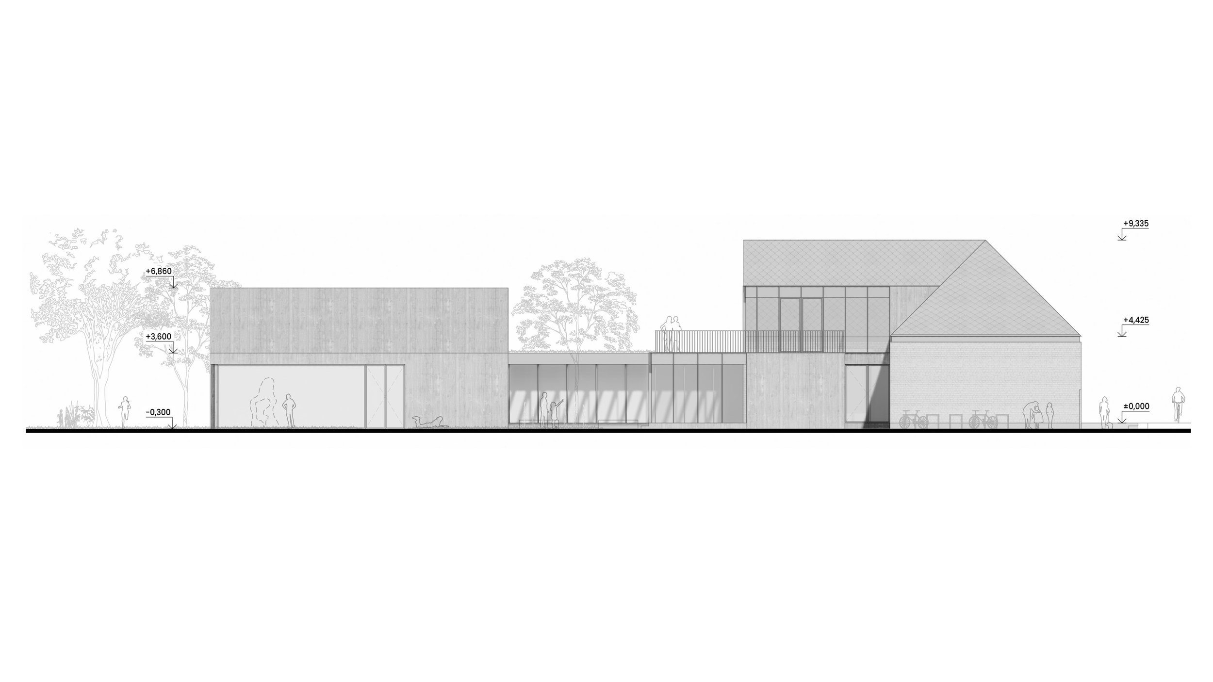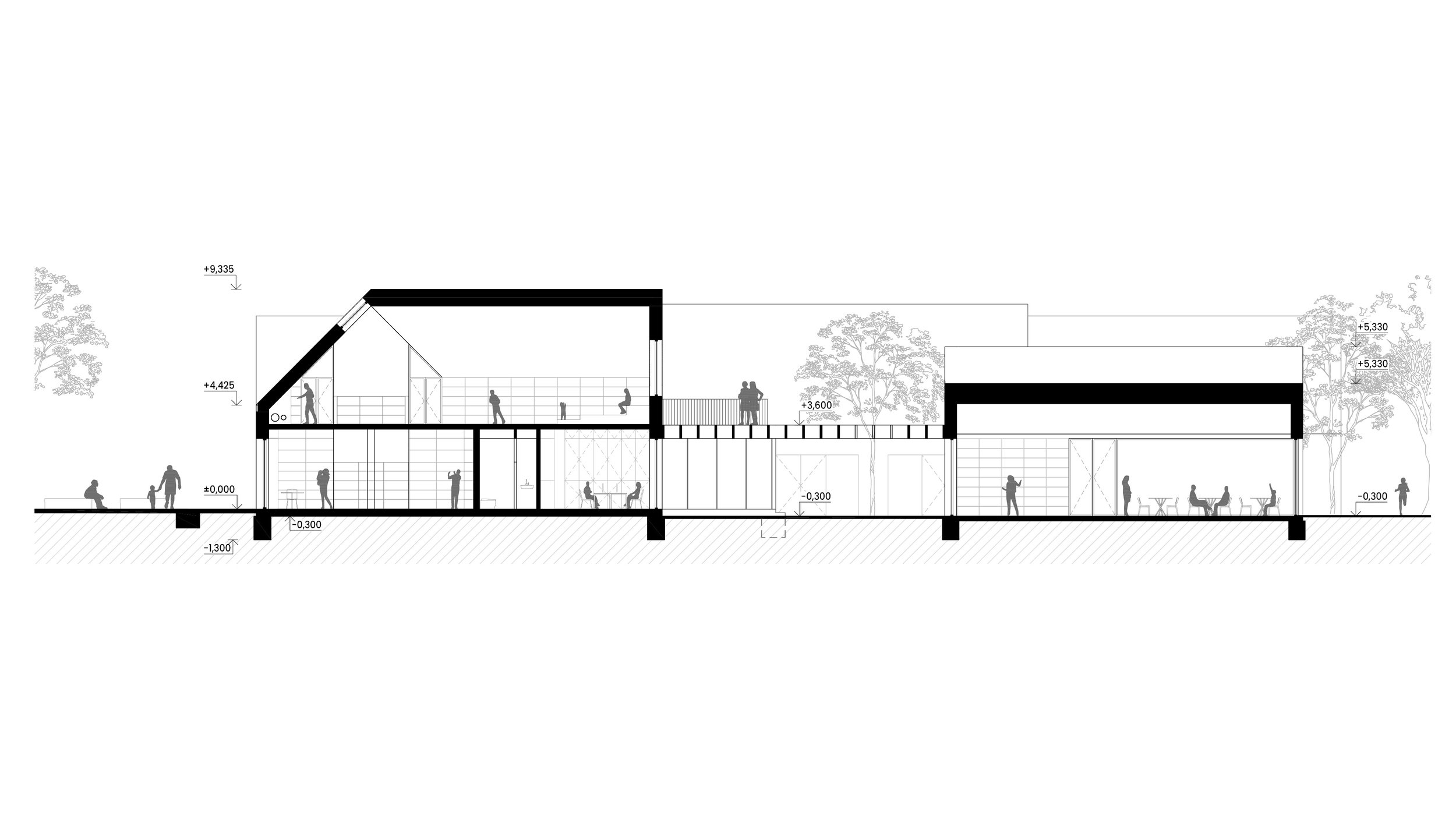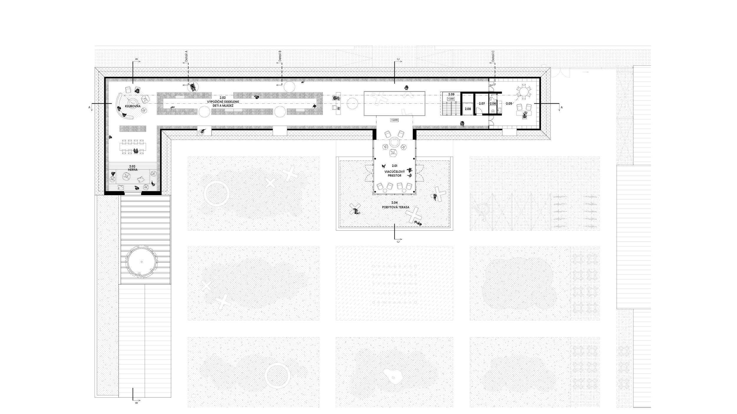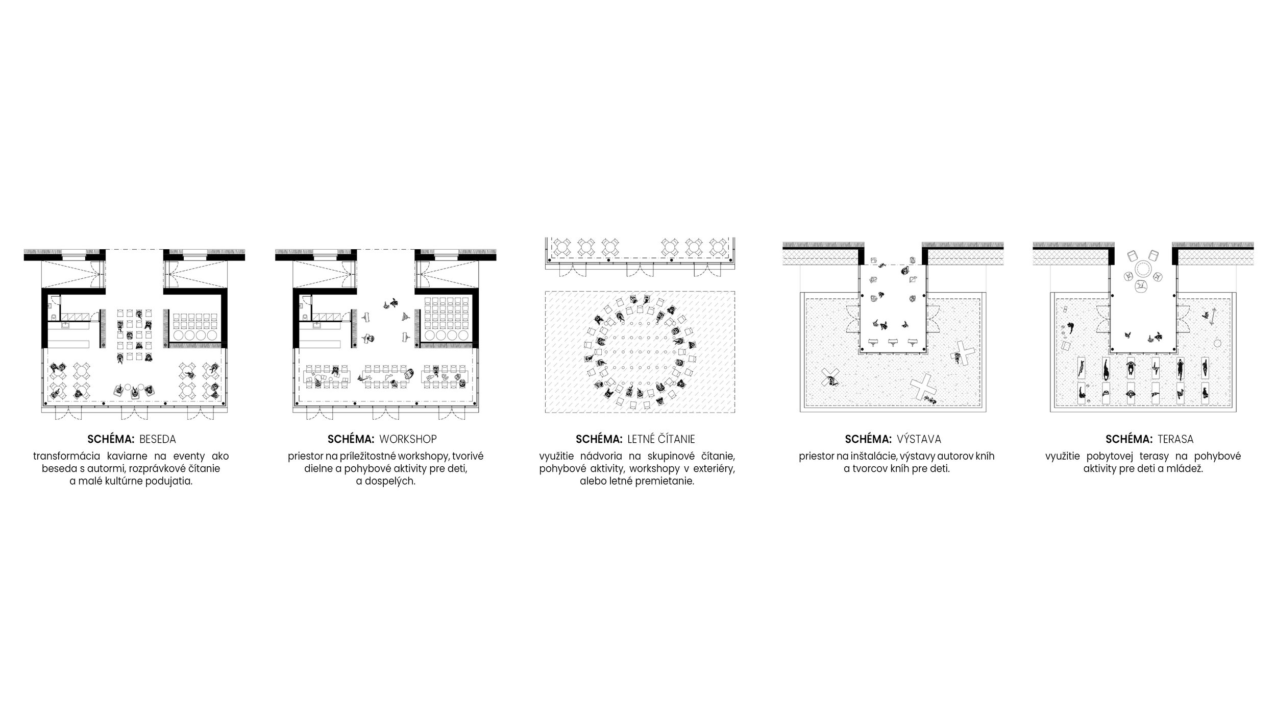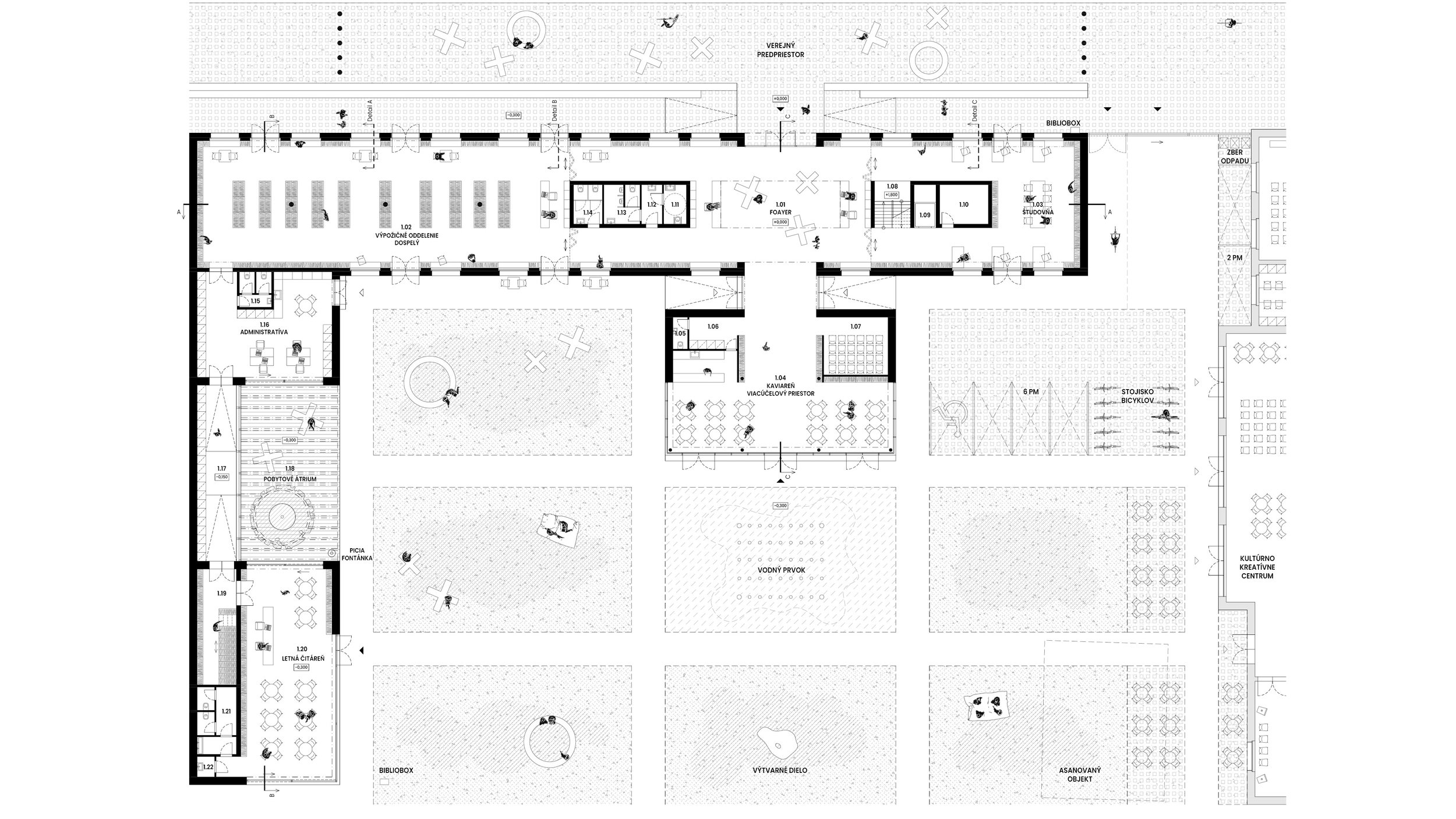 Rušná časť knižnice plynule prechádza do kaviarne a viacúčelovej prístavby, ktorá je riešená vo forme reinterpretácie rizalitu neogotického kaštieľa.