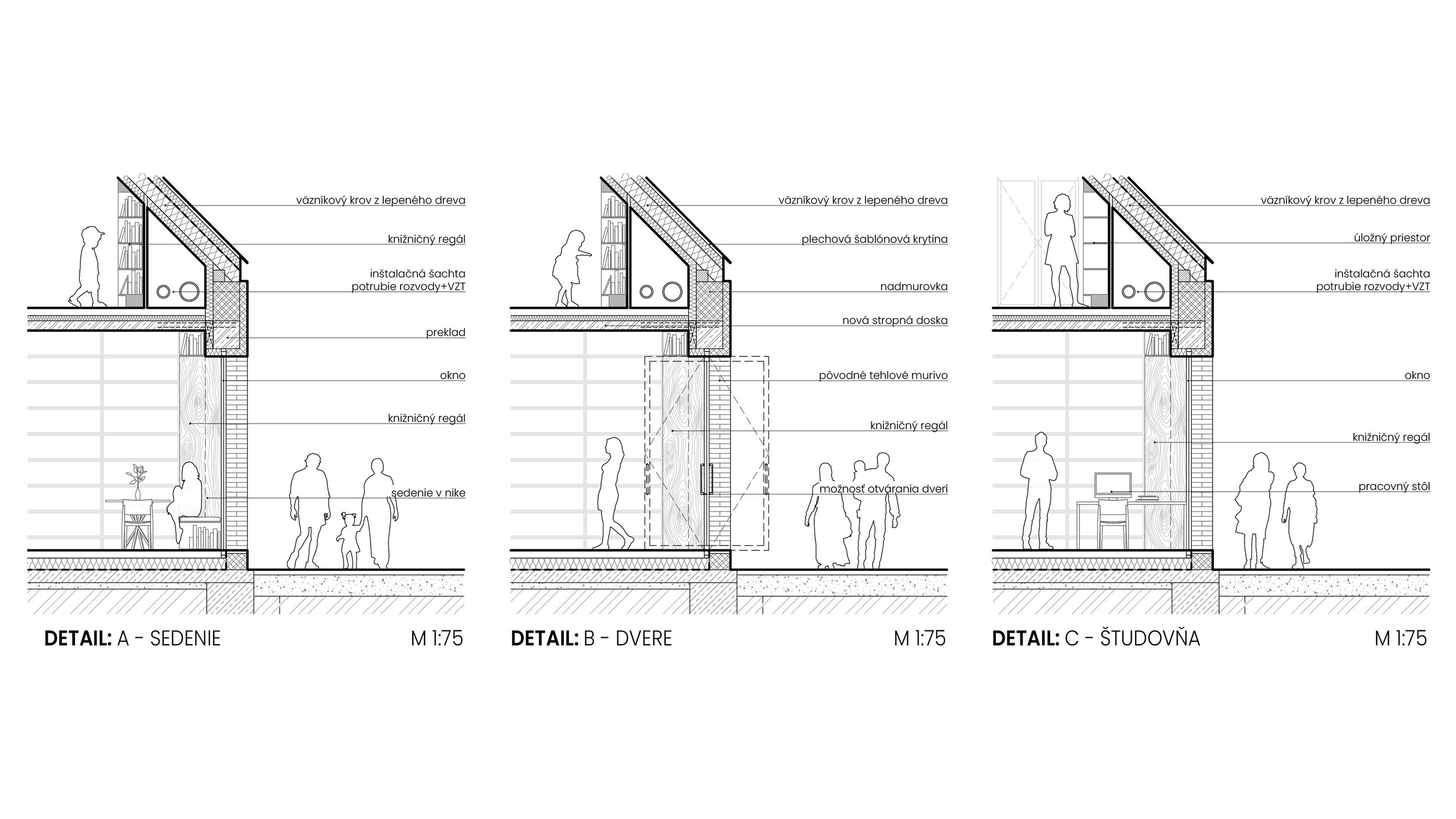 Pôvodne členené otvory rozširujeme smerom k podlahe, presvetľujeme interiér a prepájame ho s exteriérom – vizuálne knižnicu otvárame. Spolu s navrhovanými, osovo umiestnenými otvormi na juhozápadnej strane objektu vznikajú dlhé priehľady medzi parkami. Medzi blokmi okien navrhujeme v pravidelnom rytme dvere – terciálne vstupy, ktorými je možné prirodzene “vyliať“ program a aktivity modernej knižnice do exteriéru.